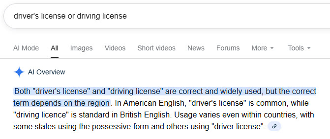 In the example, we find that the standard British English term is "driving licence", so that is what we should use for the English field.