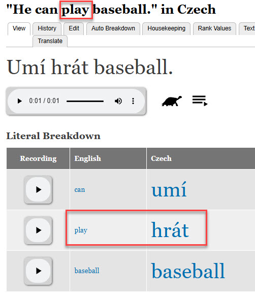 Let's investigate an example with ChatGPT and ask it to explain the detail. We use the sentence "He can play baseball", which has just "play" in the English. The goal will be to try and understand the literal breakdown in Czech:
