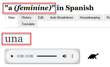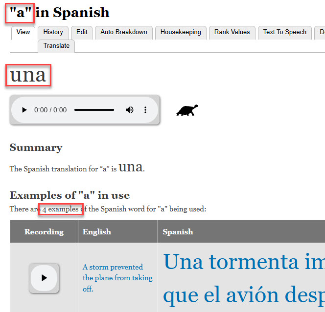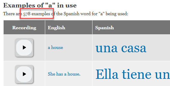 Look at the following example. We see a page for "a" in Spanish, which translates to the Spanish word "una". So far, so good. We notice there are "4 examples". OK, not every word has a lot of examples of use.
