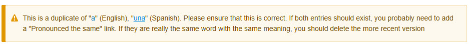 In this example, the page we are on has the English "a" and the translation "una", and the duplicate page has the identical values; the English is "a" and the translation is "una".